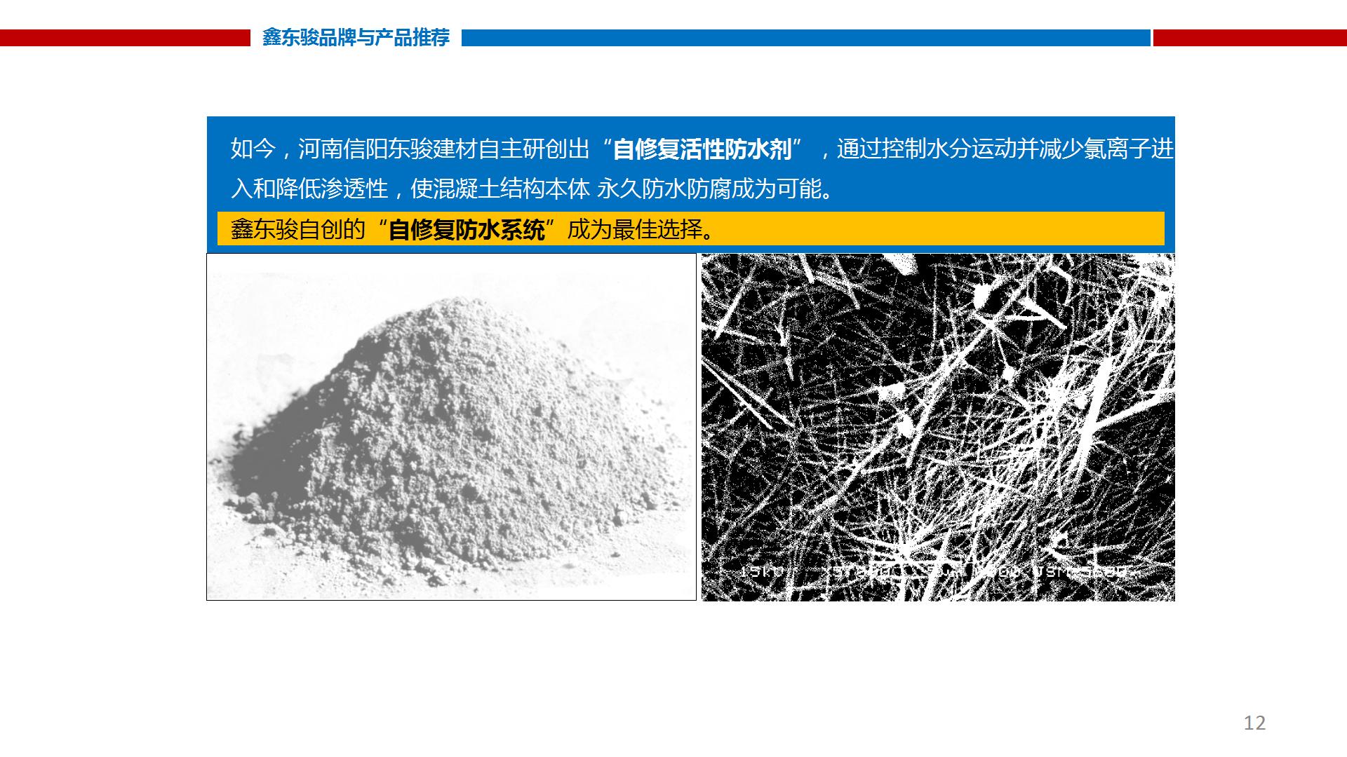 Now, Henan Xinyang Dongjun Building Materials independent research and development of the "self-repair active waterproofing agent", through the control of water movement and reduce chloride ions into and reduce permeability, so that the concrete structure body permanent waterproof and anticorrosion is possible.