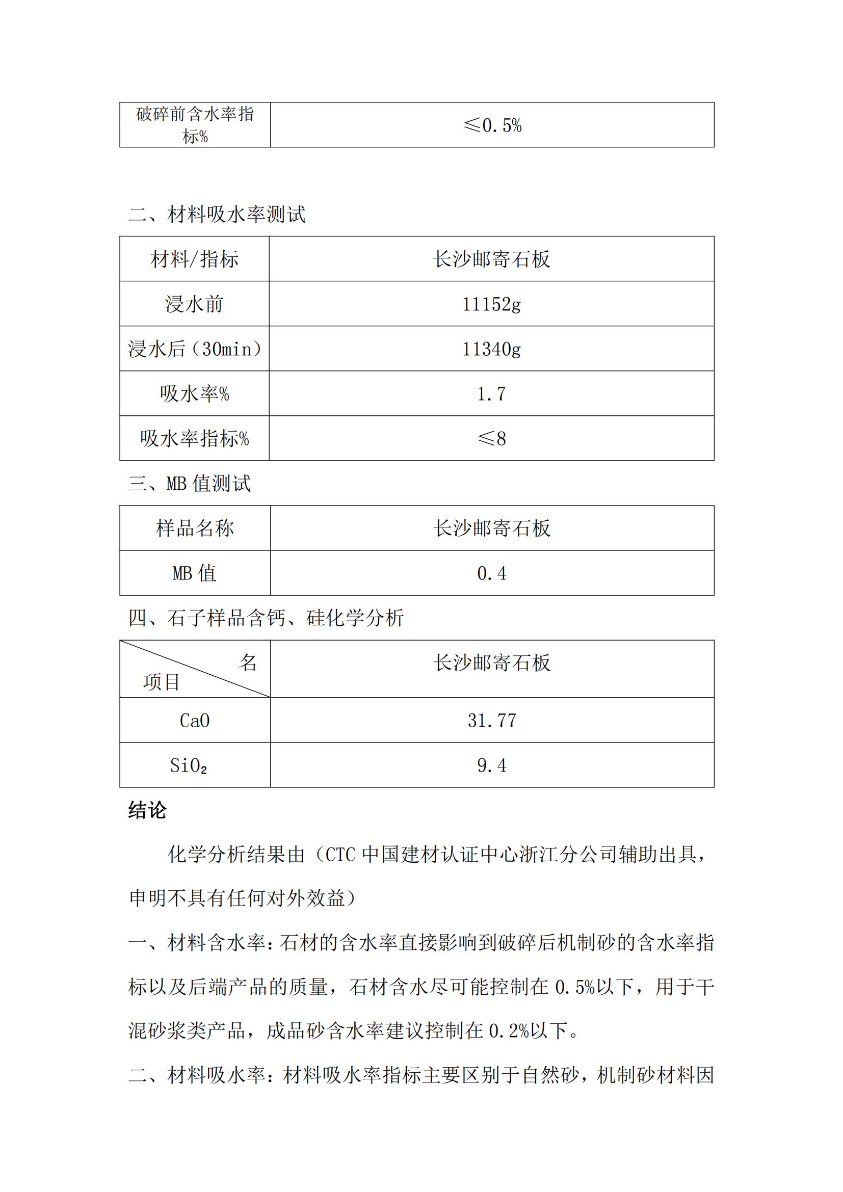 3. The MB value test area is different from the mud content test. The MB value of methylene blue mainly reflects the content of muddy substances in machine-made sand and stone powder. (Due to limited broken materials, the number of experiments is single, the data is for reference only)